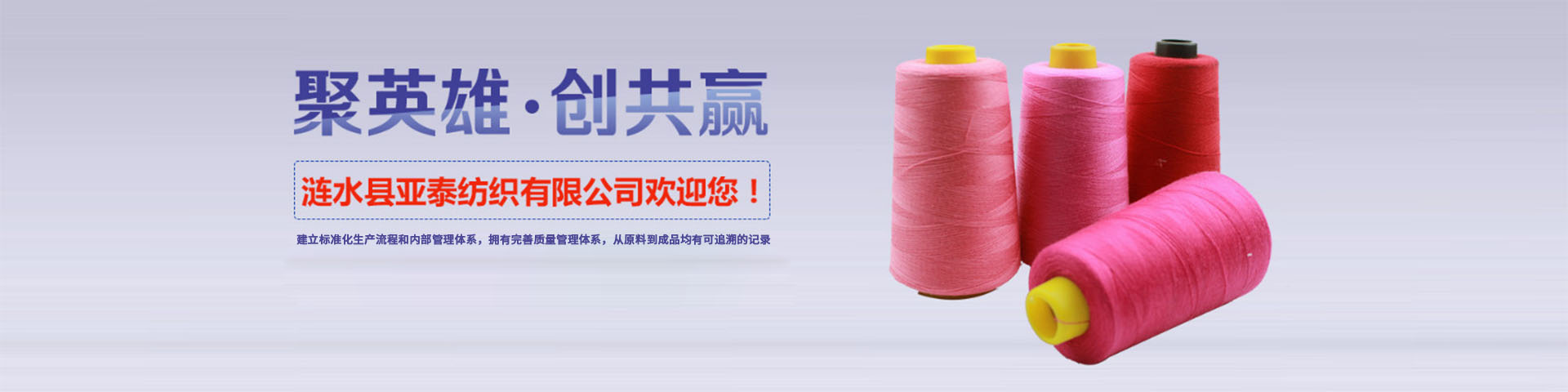 漣水縣亞泰紡織有限公司位于江蘇漣水縣,公司專業(yè)生產(chǎn)各種縫制線、織帶織布線、漁網(wǎng)線、輪胎線、風(fēng)箏線等產(chǎn)品,廣泛應(yīng)用于服裝、鞋帽、皮革、箱包、家紡、帳篷、漁業(yè)、勞保用品、運(yùn)動(dòng)用品、特種行業(yè),材質(zhì)有滌綸、錦綸、氨綸等,滿足各行各業(yè)對(duì)線的需求。公司始創(chuàng)于1998年,擁有整套先進(jìn)的染色制線設(shè)備,專業(yè)的技術(shù)管理人員,先進(jìn)的生產(chǎn)工藝。歡迎您光臨指導(dǎo)、洽談合作!